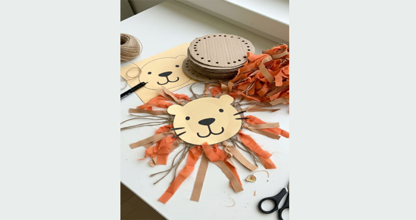 Kartonlar, ipler ve renkli şeritlerle kendi cesur aslanımızı yapıyoruz! Aslanın yüzünü tasarlıyor, yelesini iplerle süslüyor ve ortaya kocaman gülümseyen bir dost çıkarıyoruz.