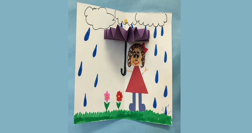 Boya ile yağmur damlaları oluşturulur. Altına 3 boyutlu şemsiye eklenir ve manzara çizilerek tamamlanır. Renklerle duyguları ifade eden sakin ve eğlenceli bir atölye çalışmasıdır.