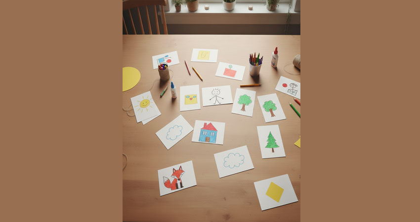 Çocuklar küçük karton kartlar üzerine basit figürler çizer: bir yüz, bir hayvan, bir ev, bir güneş. Kartlar masa üzerinde sıralanır ve bu görsellere bakarak kısa hikâyeler oluşturulur. Pano ya da sabitleme gerekmeden, tamamen masa üstünde ilerleyen bir anlatım çalışmasıdır.