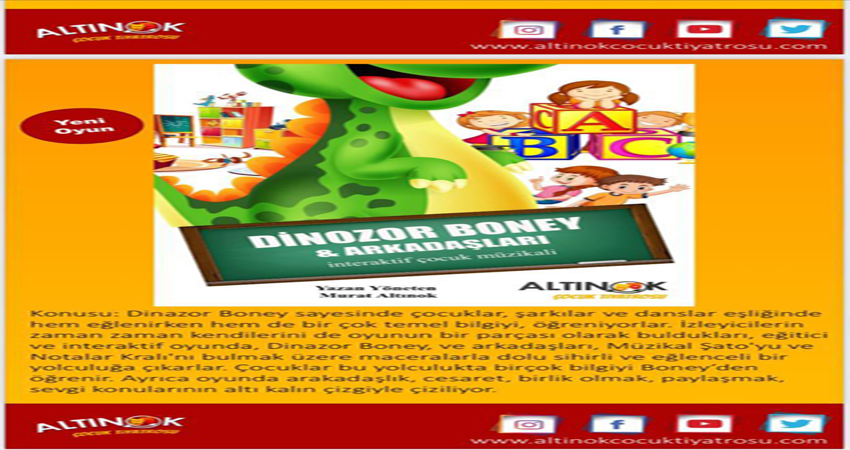 Mucizevî biçimde tarih öncesinden günümüze gelen arkadaşımız Dinozor Boney sayesinde, çocuklar şarkılar ve danslar eşliğinde hem eğleniyor, hem de birçok temel bilgiyi arkadaşımız Boney'den öğreniyorlar. İzleyicilerin zaman zaman kendilerini de bu oyunun içinde, oyunun bir parçası olarak buldukları, eğitici, interaktif çocuk oyunu Dinozor Boney ve Arkadaşları'nda; Dinozor Boney, arkadaşlarıyla birlikte, Müzikal Şato'yu ve Notalar Kralı'nı bulmak üzere maceralarla dolu sihirli ve eğlenceli bir yolculuğa çıkar. Bu müzikal interaktif oyunda, arkadaşlık, cesaret, birlik olmak, paylaşmak, sevgi gibi konuların altı kalın çizgiyle çiziliyor.