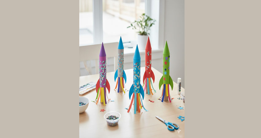 Karton rulolar roketlere dönüşüyor! Çocuklar roket gövdelerini boyuyor, pullar, simler ve renkli şeritlerle süslüyor. En sonunda roketlerimiz uzaya fırlamaya hazır hale geliyor. Hayal gücünü, el becerisini ve tasarımı bir araya getiren eğlenceli bir uzay atölyesi.