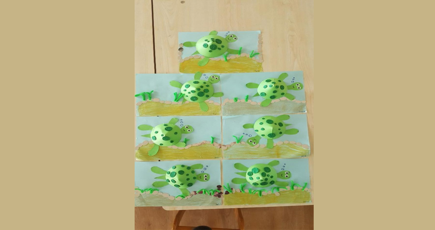 Çocuklar yarım daire gövde üzerine kıvrılmış şeritlerle kabuk dokusu oluşturur. Alt zemin boyanır, üstüne kabartmalı halkalar yerleştirilir.