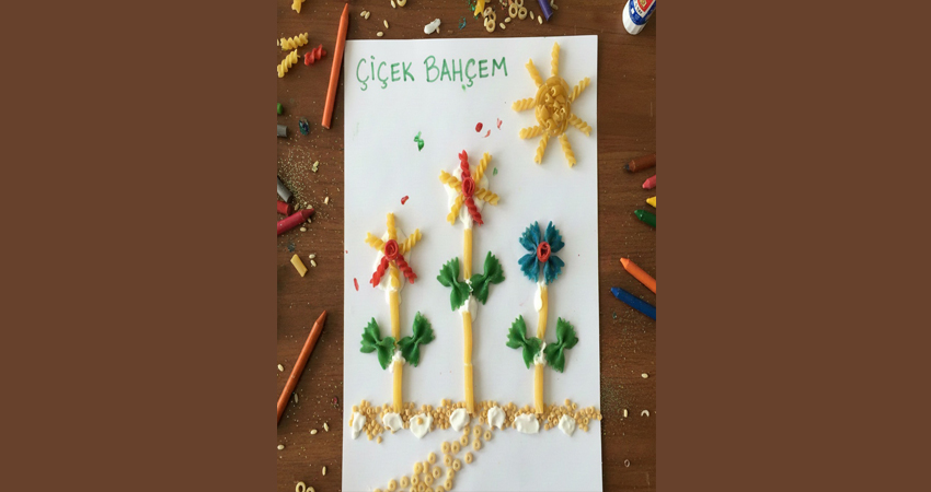 Boyanmış makarna taneleri çiçek yaprakları olarak kartona yapıştırılır. Çocuklar kendi bahçelerini tasarlarken hem el becerisi gelişir hem de tasarımdan büyük keyif alırlar.