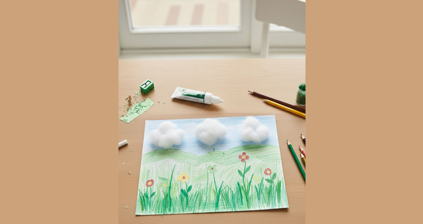 Kâğıt, pamuk ve yeşil tonlar kullanılarak çocukların kendi küçük doğa alanlarını oluşturması sağlanır. Çimenler, çiçekler ve ağaç benzeri formlar tamamen çocuğun hayal gücüne göre şekillenir. Yerleştirme ve yapıştırma çalışmaları ince motor becerilerini destekler.