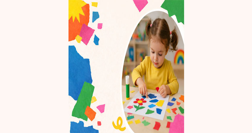 Minik parçalar, büyük keşif! Çocuklar renkli kâğıtları koparıp yapıştırarak kendi kompozisyonlarını oluşturur. El kasları gelişir.